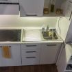 Angolo cottura attrezzato (piano cottura induzione, microonde, macchina del caffè, bollitore, frigorifero, stoviglie e pentole)